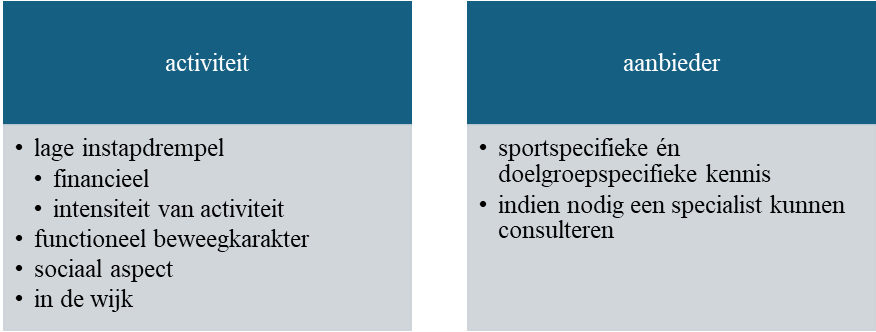Activiteiten met een lage intensiteit en instapdrempel werden positief beoordeeld door de deelnemers. Wanneer er geen of lage kosten zijn voor deelname, er geen extra materiaal (bijvoorbeeld specifieke sportkledij) nodig is en wanneer er geen hoge eisen aan sportieve/motorische vaardigheden of fysieke conditie zijn verbonden, ervaren de ouderen dit als uitnodigend (zie figuur 1). Daarnaast sluiten activiteiten met een deels ook functioneel karakter beter aan bij de behoefte van de deelnemers dan activiteiten waarbij het echt alleen om het bewegen zelf gaat. Zo werd het bevorderen van balans en mobiliteit tijdens Qi Gong positief ontvangen omdat het hen in hun dagelijks leven helpt bij, bijvoorbeeld, een kopje van de bovenste plank van de kast pakken. Deelnemers gaven verder aan dat het waardevol is als de activiteit ook een sociaal karakter heeft. Zij zagen het samen napraten bij een kopje koffie als een cruciaal onderdeel van het succes van een bijeenkomst. Naast de inhoud van de activiteit is ook de bereikbaarheid van de locatie erg belangrijk. Zo was er een duidelijke voorkeur voor activiteiten dichtbij, dus in de wijk zelf.