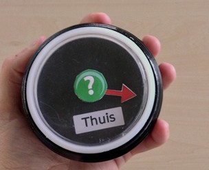 Gebaseerd op de input van mensen met dementie en experts tijdens de eerste iteratie, leidde de tweede iteratie tot een eenvoudig en herkenbaarder ontwerp, dat de uitstraling van een kompas had (figuur 1). Er werden ook verschillende nieuwe elementen in overweging genomen zoals: Het toevoegen van een klein display met daarop de letters “THUIS” als indicatie voor het doel waar de pijl heen wijst, en een centrale knop met een “thuis” icoon waarmee je kunt bellen naar een persoonlijk contact als je de weg kwijt bent. In deze fase werden mensen met dementie betrokken via een focusgroep om deze ideeën te bespreken, een beproefde methode aangepast op maat voor deze doelgroep (Wilkinson, 2002). Vier mensen met dementie en drie mantelzorgers namen deel. De reacties waren overwegend positief in relatie tot de vormgeving en de functionaliteit; de belangrijkste uitkomst was dat er een algemene wens was voor meer eenvoud, extra knoppen werden als verwarrend beschouwd. Deelnemers benadrukten dat de technologie goed moest werken. Ook werd de robuustheid van het apparaat genoemd; het moet weer- en stootbestendig zijn aangezien het product mee naar buiten wordt genomen en het voor dagelijks gebruik is. De meeste deelnemers gaven de voorkeur aan een kleiner formaat (ongeveer 10 cm). Het toegevoegde ‘thuis’-icoon bleek ook verwarrend, omdat het de suggestie wekte dat het apparaat van huis afwees in plaats van ernaartoe.