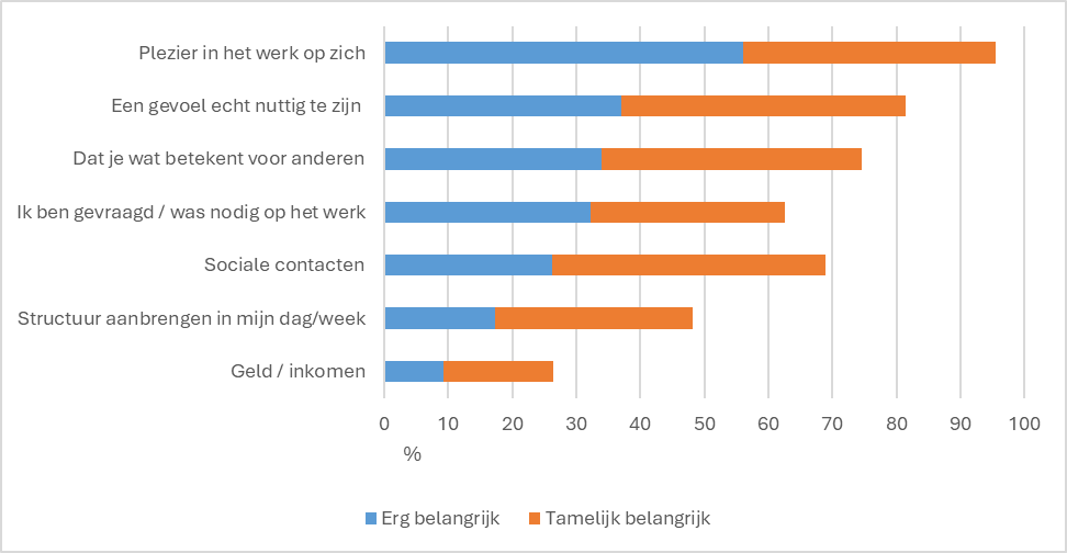 Bijna één op de vier (23%) deelnemers aan de NPPS heeft na de pensionering nog betaald werk verricht. In 2023 werkte ongeveer de helft hiervan nog steeds. Aan werkzame deelnemers is gevraagd waar zij werkten, en hoe belangrijk verschillende motieven waren voor de keuze voor betaald werk. Ongeveer 33 procent gaf aan nog voor de oude werkgever te werken. In figuur 2 is voor verschillende motieven weergegeven welk aandeel van de deelnemers aangaf deze tamelijk of erg belangrijk te vinden. Intrinsieke drijfveren voeren de boventoon: plezier in het werk op zich (95%), een gevoel echt nuttig te zijn (81%) en dat je wat betekent voor anderen (75%) zijn de belangrijkste motieven. Geld / inkomen is slechts voor een minderheid van de deelnemers (26%) tamelijk of erg belangrijk. Ik ben gevraagd / was nodig op het werk speelde voor de meerderheid (62%) van de deelnemers ten minste een tamelijk belangrijke rol, en voor 32 procent zelfs een erg belangrijke rol. Desgevraagd geeft ruim 13 procent van de deelnemers aan dat dit voor hen de belangrijkste reden is om nog betaald werk te doen (niet weergegeven in figuur).