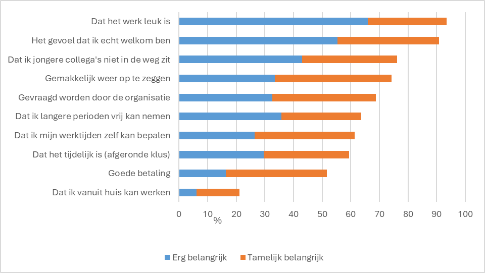 De meerderheid van de gepensioneerden werkte in 2023 niet en heeft ook geen betaald werk meer gedaan na hun pensionering. Aan deze groep is gevraagd of men interesse had om eventueel opnieuw te gaan werken. Opmerkelijk is dat een aanzienlijk deel van deze niet-werkende gepensioneerden toch nog open stond voor een terugkeer naar betaald werk: 30 procent gaf aan waarschijnlijk of zeker interesse te hebben. Op de vraag waar men zou willen werken, blijkt vooral de voormalig werkgever populair: 75 procent van deze groep geeft aan interesse te hebben daar opnieuw aan de slag te gaan. In figuur 4 hebben we voor gepensioneerden die interesse hadden weer voor hun oude werkgever te gaan werken weergegeven welke zaken daarbij van belang zijn. De belangrijkste voorwaarde is dat het werk leuk is: bijna 94 procent van de deelnemers geeft aan dat erg of tamelijk belangrijk te vinden. Maar ook hier is initiatief vanuit de werkgever belangrijk. Gevraagd worden door de organisatie is voor bijna 69 procent van de deelnemers erg of tamelijk belangrijk. Nog hoger scoren twee andere zaken: het gevoel echt welkom te zijn (91%), en jongere collega’s niet in de weg te willen zitten (76%). Deze zorgen worden waarschijnlijk ook al deels weggenomen wanneer de werkgever een gepensioneerd oud-werknemer benadert.