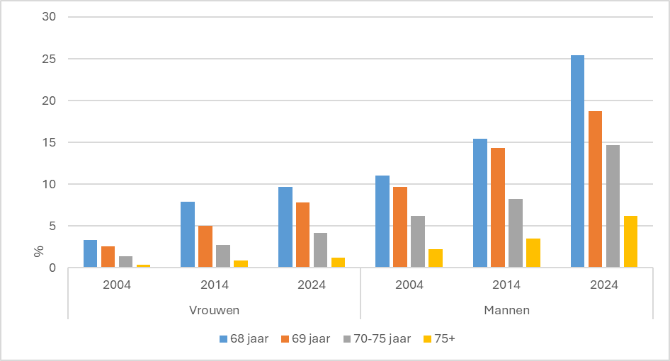 De afgelopen 20 jaar is het steeds gebruikelijker geworden om tot op hogere leeftijd door te werken. Uit cijfers van het CBS (figuur 1) blijkt dat de arbeidsdeelname onder 68-plussers sinds 2004 sterk is toegenomen. Deze groei beperkt zich zeker niet tot 68- en 69-jarigen, die anno 2024 pas relatief recent de AOW-leeftijd hadden bereikt. Onder 75-plussers verdrievoudigde de arbeidsdeelname tussen 2004 en 2024 ruim (van 1,2% naar 3,7%), en onder 70 tot 75-jarigen bijna (van 3,6% naar 9,7%). Daarnaast is ook de arbeidsdeelname onder AOW-gerechtigde vrouwen sterk gegroeid, waardoor het verschil tussen mannen en vrouwen kleiner is geworden. De hogere arbeidsdeelname onder AOW-gerechtigden kan de structurele krapte op de arbeidsmarkt iets verruimen, temeer omdat de groep AOW-gerechtigden flink zal blijven groeien.