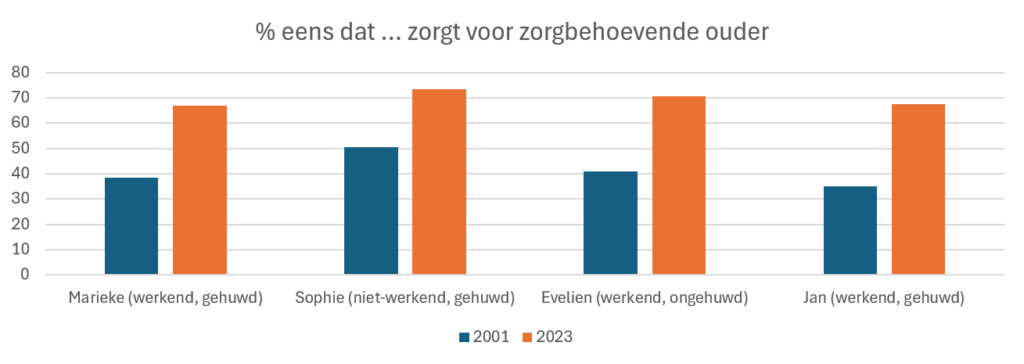 Figuur 1. Het percentage respondenten dat vindt dat het vignet (Marieke, Sophie, Evelien of Jan) moet zorgen voor de zorgbehoevende ouder (2001 en 2023).
