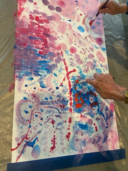 Figuur 2 en 3: Een empathische ruimte creëren en beginnen met collaboratief druppelschilderen in the Northern Norwegian Art Museum in Trømso, Noorwegen (Foto: Janine Schrijver)