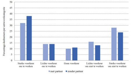 De bevinding in de wetenschappelijke literatuur dat singles later met pensioen gaan dan werknemers met een partner is voornamelijk gebaseerd op gedragsdata. Om na te gaan of singles ook later met pensioen willen is het antwoord van deelnemers aan het NIDI Pensioen Panel Onderzoek op de vraag “Wat zou uw voorkeur zijn voor uw werksituatie over een jaar?” onderzocht. Werknemers konden kiezen tussen vijf antwoordmogelijkheden: een sterke respectievelijk lichte voorkeur om dan te werken, geen voorkeur, en een sterke respectievelijk lichte voorkeur om dan niet te werken. Figuur 1 laat het percentage werknemers per antwoordcategorie naar partnerschapsstatus zien. Zoals verwacht hadden singles inderdaad een iets sterkere voorkeur om te blijven werken en dus later met pensioen te gaan. Uit analyses blijkt dat het verschil in pensioenvoorkeur tussen werknemers met en zonder partner statistisch significant, maar relatief klein was. Singles gaan dus niet alleen later met pensioen, maar willen dat ook. Hoe kunnen wij dit verschil verklaren?