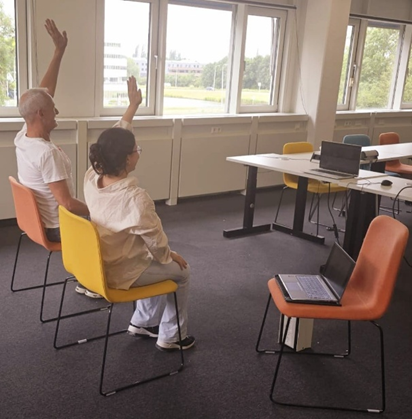 • Voor ouderen van de Zonnehuisgroep Amstelland is een online beweeg-halfuurtje ontwikkeld (zie figuur 1). Hiervoor werd dezelfde groepsgesprekkenknop op de tablet gebruikt als bij het gezamenlijk koffiemoment. Studenten en professionals stelden een programma samen met laagdrempelige oefeningen op de stoel zoals appels plukken, benen strekken en nek rollen. Na enkele sessies voegden ze ter verlevendiging van de bijeenkomst, een achtergrondmuziekje toe.