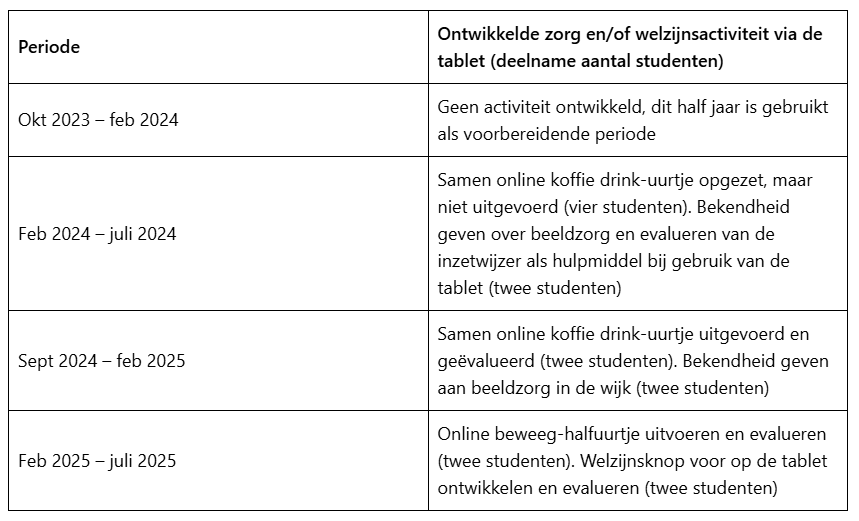 Van 2023 tot 2025 werkten studenten, professionals en docenten op deze nieuwe manier samen. Het IP-LIN fungeert daarbij als proeftuin: een plek waar mogelijkheden voor online ondersteuning via de tablet ontwikkeld, getest en verbeterd worden. Zo dragen thuiszorg- en welzijnsorganisaties er aan bij dat ouderen langer prettig en zelfstandig thuis kunnen wonen. De centrale onderzoeksvraag luidt: Welke ondersteuningsactiviteiten via de tablet kunnen worden ontwikkeld voor thuiswonende kwetsbare ouderen, en hoe worden deze ervaren door ouderen, studenten en professionals? Elke woensdagmiddag ontmoetten studenten, professionals en docenten elkaar in een van de thuiszorginstellingen. Studenten deden mee tijdens hun halfjaarstage. Op woensdag ontwikkelden en evalueerden zij samen nieuwe online activiteiten, op donderdag boden zij deze aan de ouderen aan. Daarnaast verzorgden ze reguliere beeldzorg, zoals ondersteuning bij dagstructuur, medicatie-inname, bloedsuikercontrole of veiligheid bij het douchen (voor- en nabelletje).